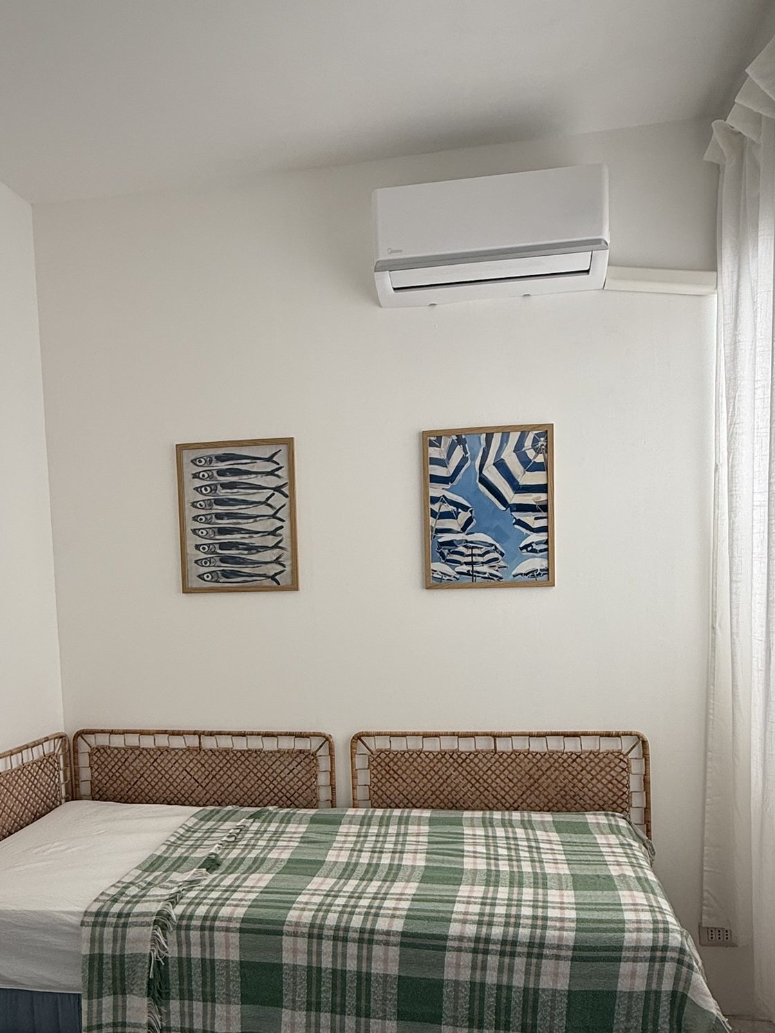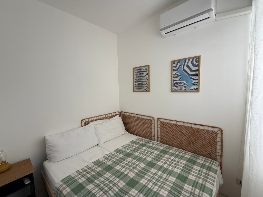 Najmniejszy pokój – pokoik. Jest tu łóżko dla jednej lub dwóch osób (rozkłada się do pełnowymiarowego 160×200!), szafka nocna i będzie jeszcze wąski słupek na tyle, żeby móc położyć ubrania. Ze wsuniętymi walizkami kabinowymi pod łóżko, jest przytulną i wygodną opcją, mimo małych gabarytów.